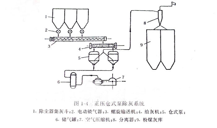 圖1—4是常用的正壓倉(cāng)式泵除灰系統(tǒng),在此系統(tǒng)中,從干式除塵器分離下的灰,經(jīng)電動(dòng)鎖氣器、螺旋輸送機(jī)和給灰機(jī)進(jìn)入倉(cāng)式泵、用壓縮空氣將灰吹送。